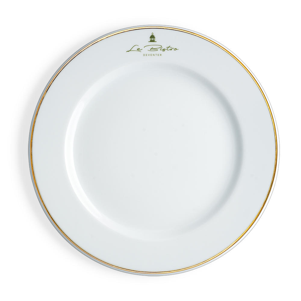 Hoe ziet zo’n lijnbedrukking eruit en wat is het eigenlijk? Het is eigenlijk heel simpel: de buitenste rand van het bord wordt bedrukt. Deze rand rondom het bord krijgt dus een kleurtje. Hoe kunnen we het makkelijker uitleggen, dan het gewoon te laten zien? Op de afbeelding zie je de borden die we voor Le Bistro, uit Deventer, bedrukten. Deze borden hebben naast het logo bovenaan de rand ook een rand rondom het bord: een gouden rand wel te verstaan.